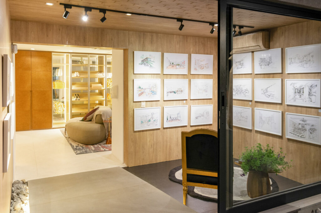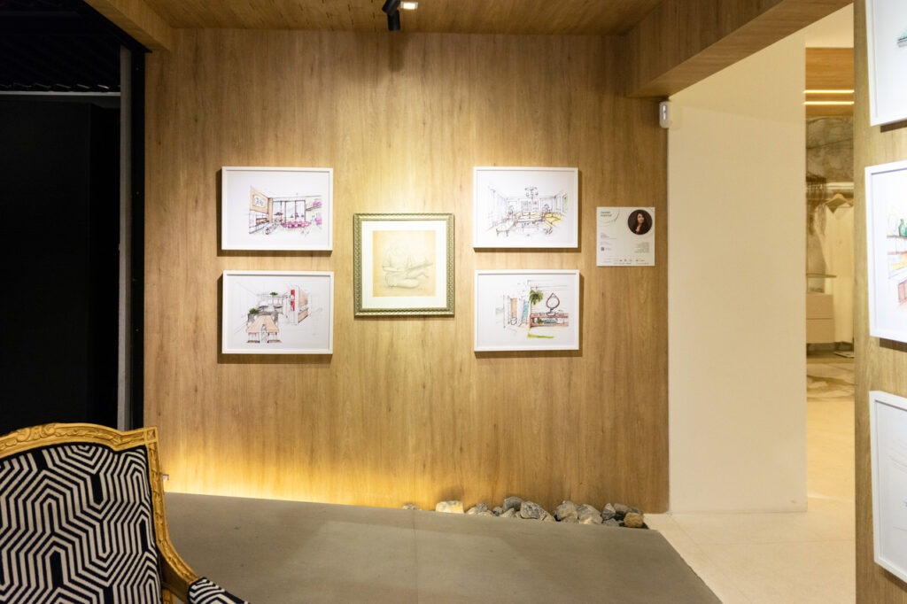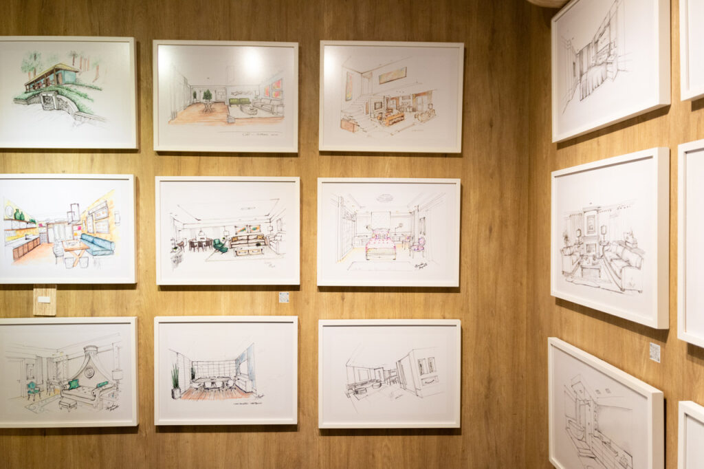 O espaço Galeria expõe o trabalho realizado por Bianka Mugnato em forma de arte. As características originais do ambiente, como revestimentos e piso, foram mantidas. Os 22 croquis, escolhidos entre 600 realizados durante a carreira da designer, são a essência do espaço e revelam uma expressão artística e absolutamente técnica no sentido da composição dos projetos, em que cada traço estabelece um elo sentimental entre o cliente, o ambiente e a profissional, que filtra o que fica adequado tecnicamente e esteticamente para aquele projeto.