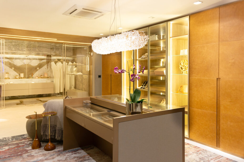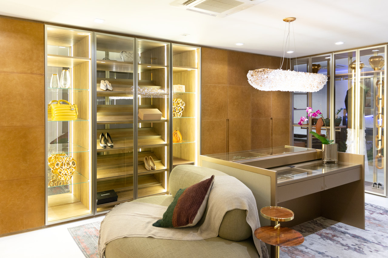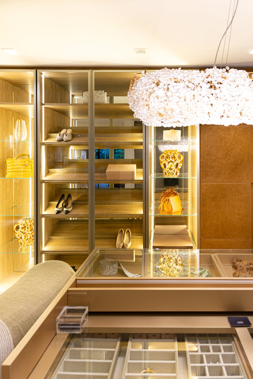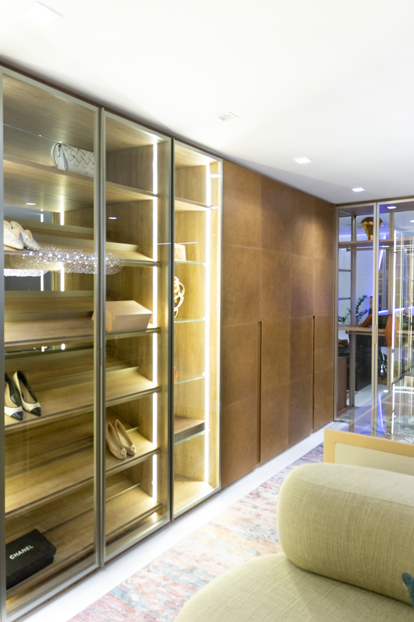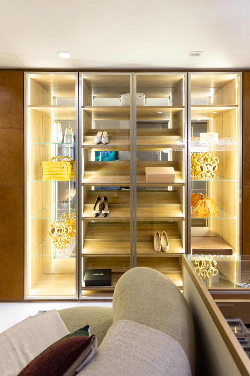 O closet é desejo de muitas pessoas. Este em específico, é dividido em duas partes: feminina e masculina. Na parte feminina, as portas em vidro permitem a exposição de peças como bolsas, sapatos e jóias e, desta forma, Daniela Colnaghi apresenta com sofisticação um ambiente aconchegante. No armário masculino, sobriedade nos acabamentos com detalhe para os interiores, compostos em estofados.