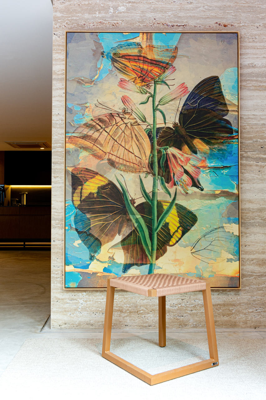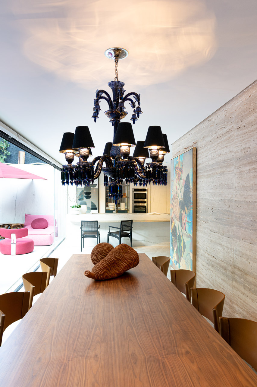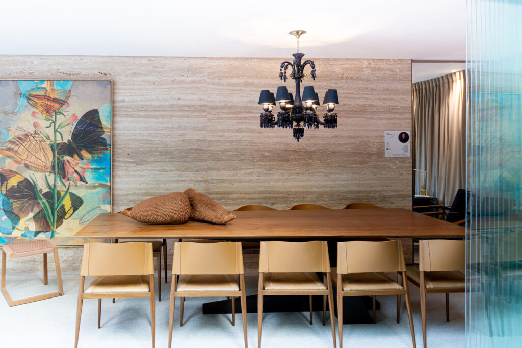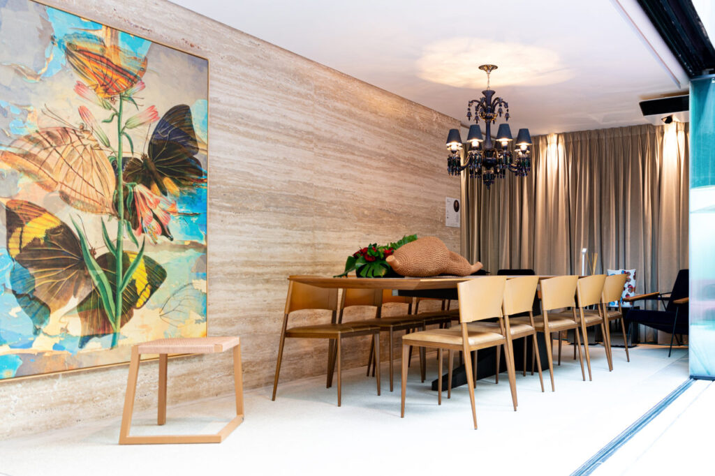 O espaço criado por Júlio Dantès traz referências da década de 1940, período que influenciou as décadas seguintes na decoração. As texturas e cores escolhidas se complementam, com cortina em veludo, pendente em cristal, mesa em madeira, pedra natural e o tapete em borracha. Um dos destaques do ambiente é o Banco Rick, criado pelo próprio designer. O resultado do mix de elementos trouxe um ambiente requintado e ousado.