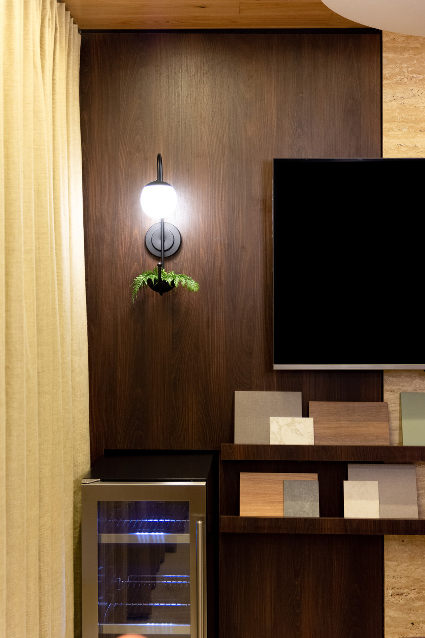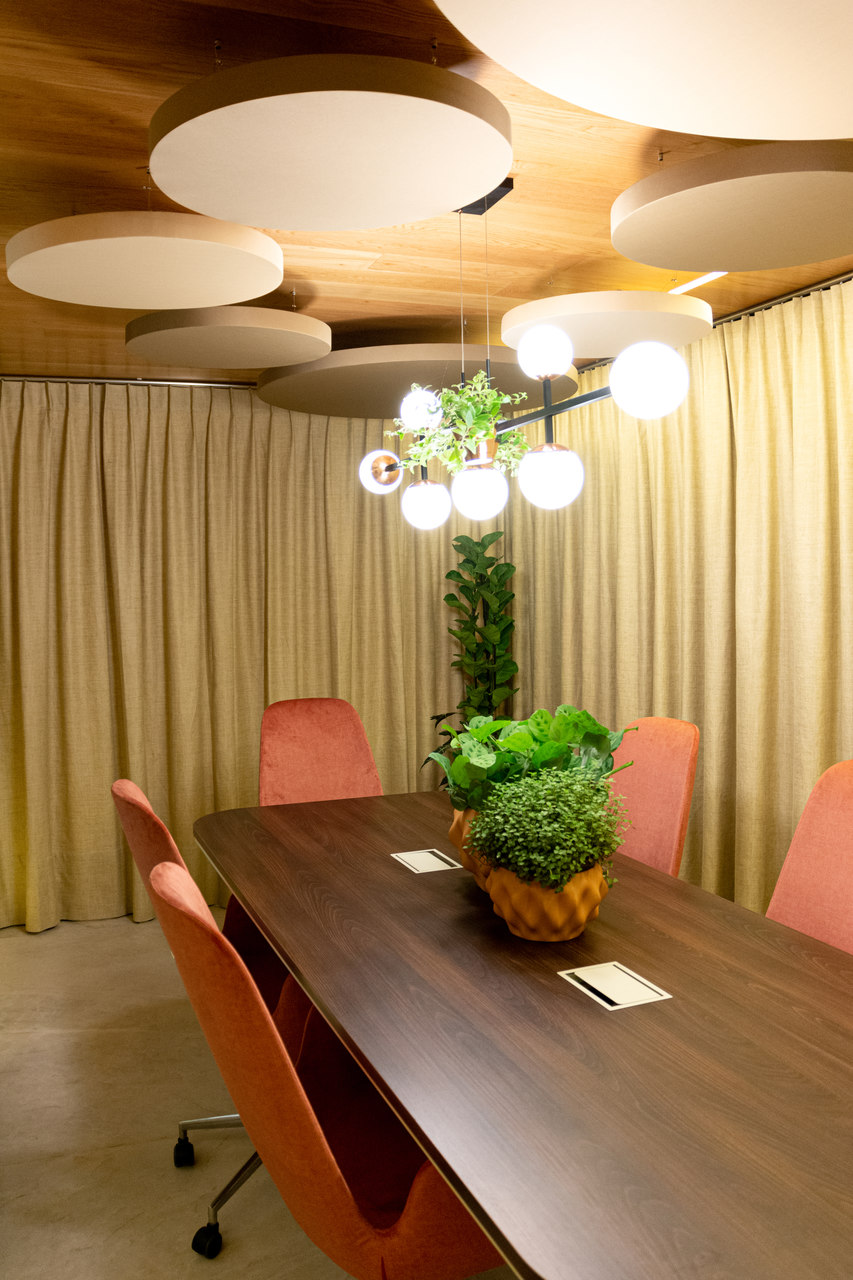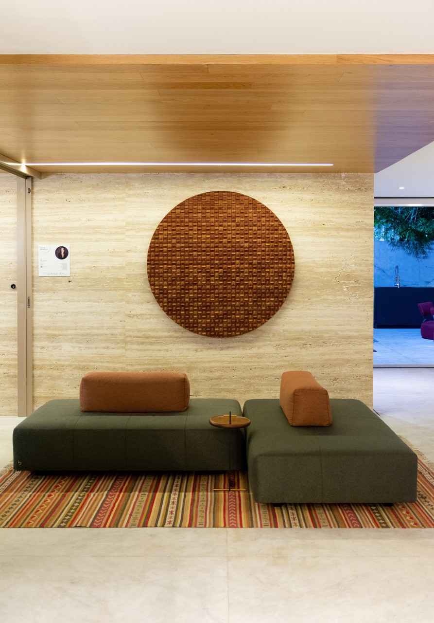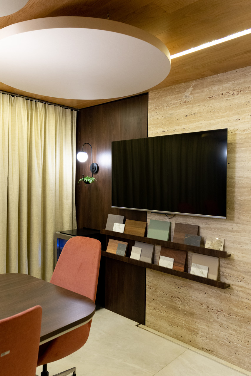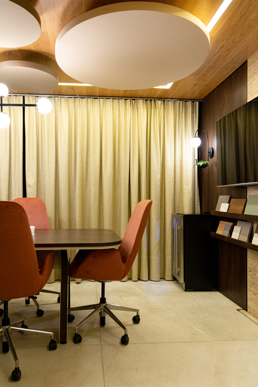 O projeto propõe espaços flexíveis tanto para criação de conteúdo com podcast e videocast, como também, a promoção de encontros e reuniões no living que se conecta à reunião para 6 pessoas. O mobiliário foi escolhido para dar mais força, flexibilidade e conexão com o showroom, com a presença de sofás modulares, cores e acabamentos com tons quentes e terrosos para criar um espaço acolhedor e exclusivo.