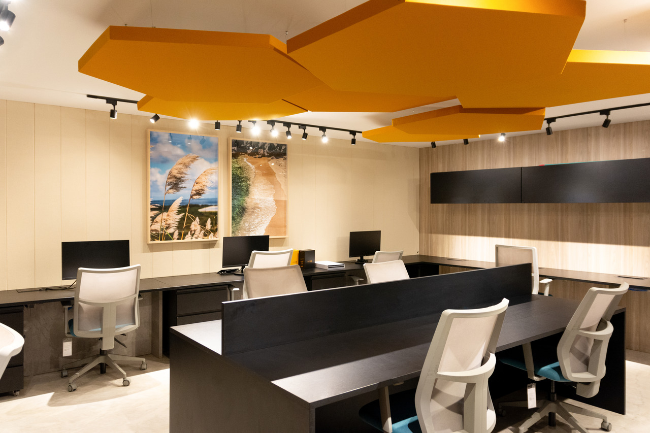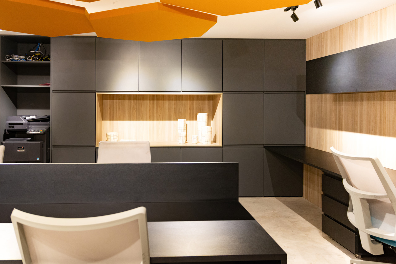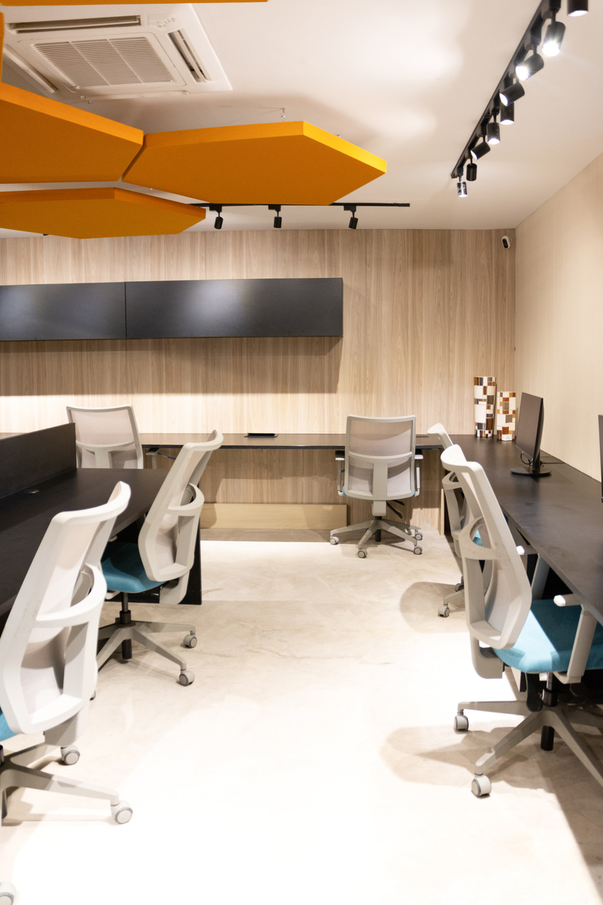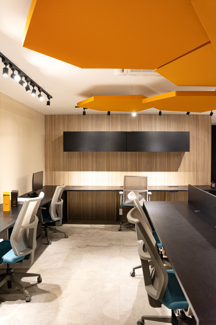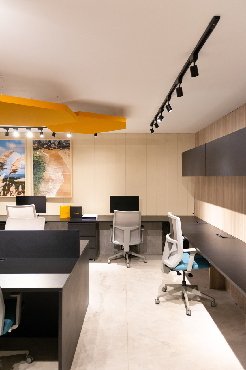 Um espaço descontraído, com composição de cores neutras e tons alegres das nuvens acústicas, que por sua vez trouxeram movimento ao ambiente. Para a iluminação, foram posicionados trilhos eletrificados com spots direcionados estrategicamente para as estações de trabalho. Na decoração, peças pontuais que proporcionam personalidade e leveza ao espaço.