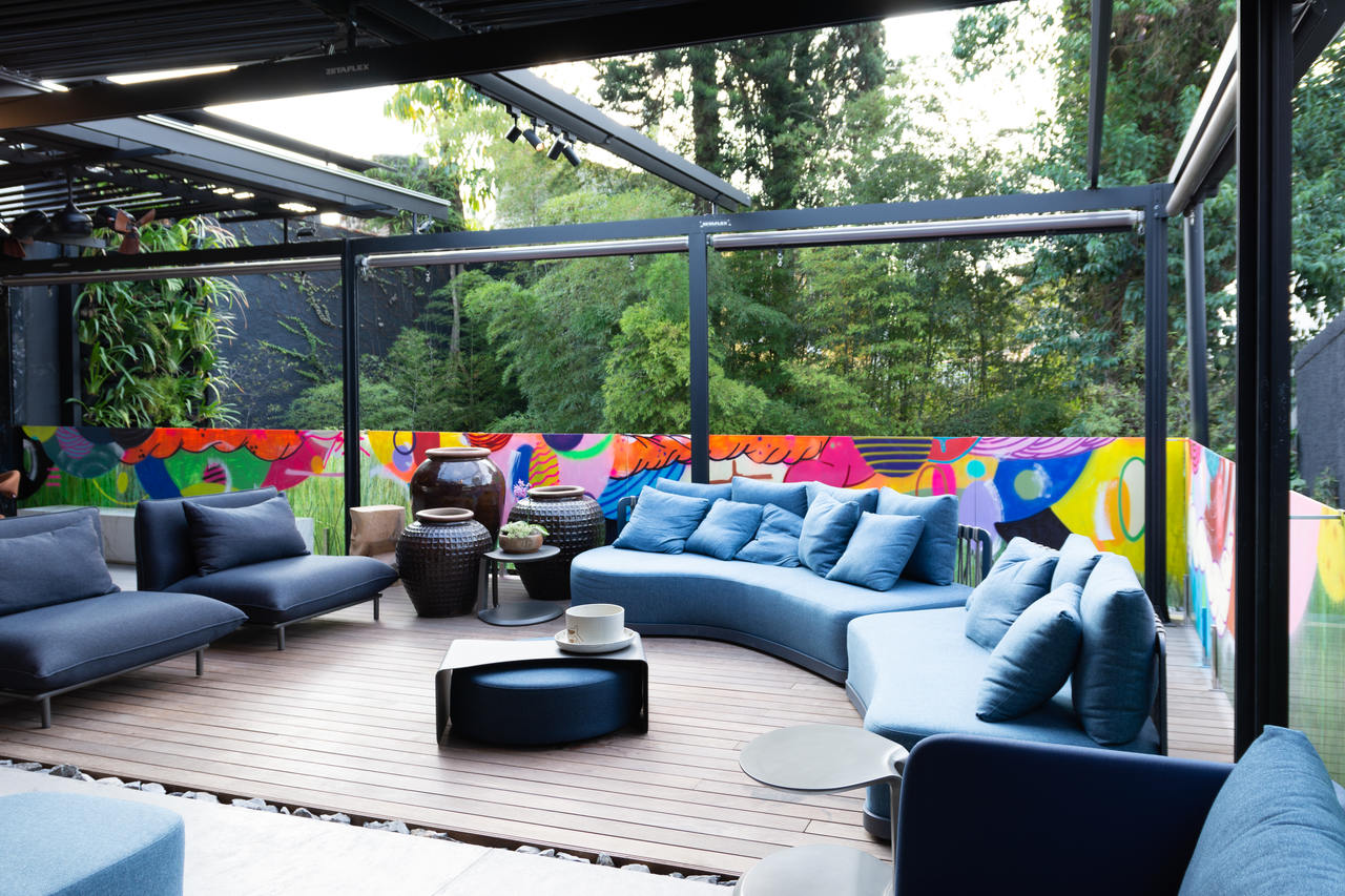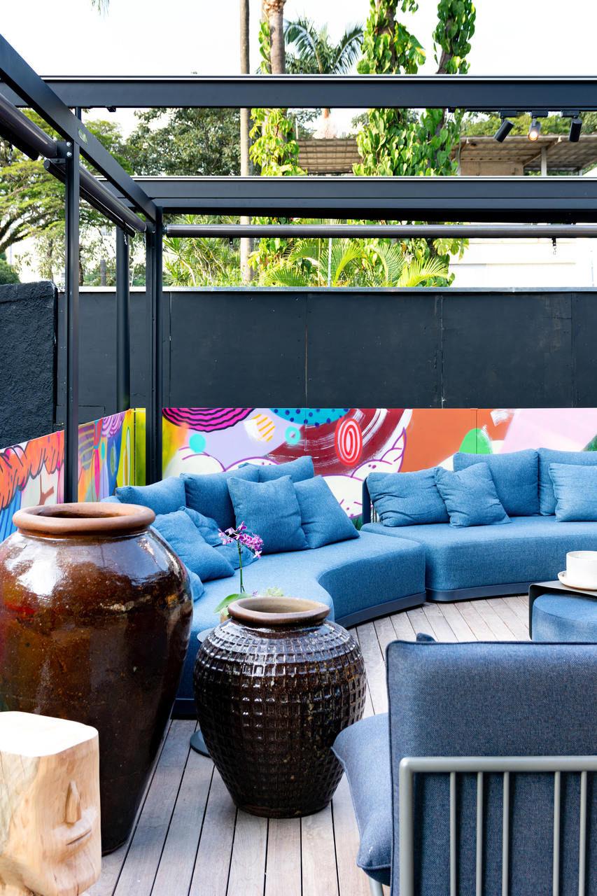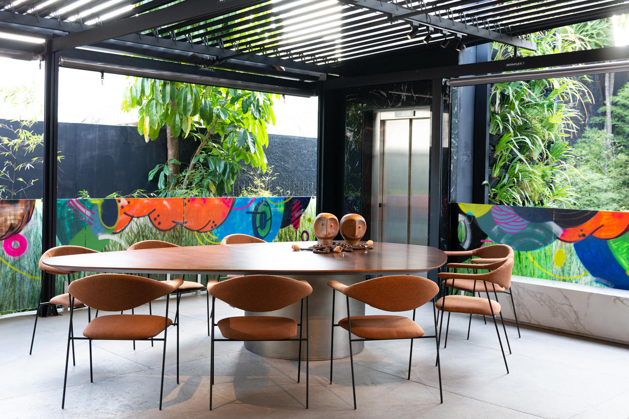 Para celebrar e receber, o espaço projetado por Wesley Lemos traz o vinho e o vinil como inspirações. O design brasileiro é protagonista no rooftop, com acabamentos e texturas escolhidas para proporcionar conforto, e tons terrosos misturados ao verde e azul. Um ambiente descontraído e sofisticado para apreciadores de vinho e diversão.